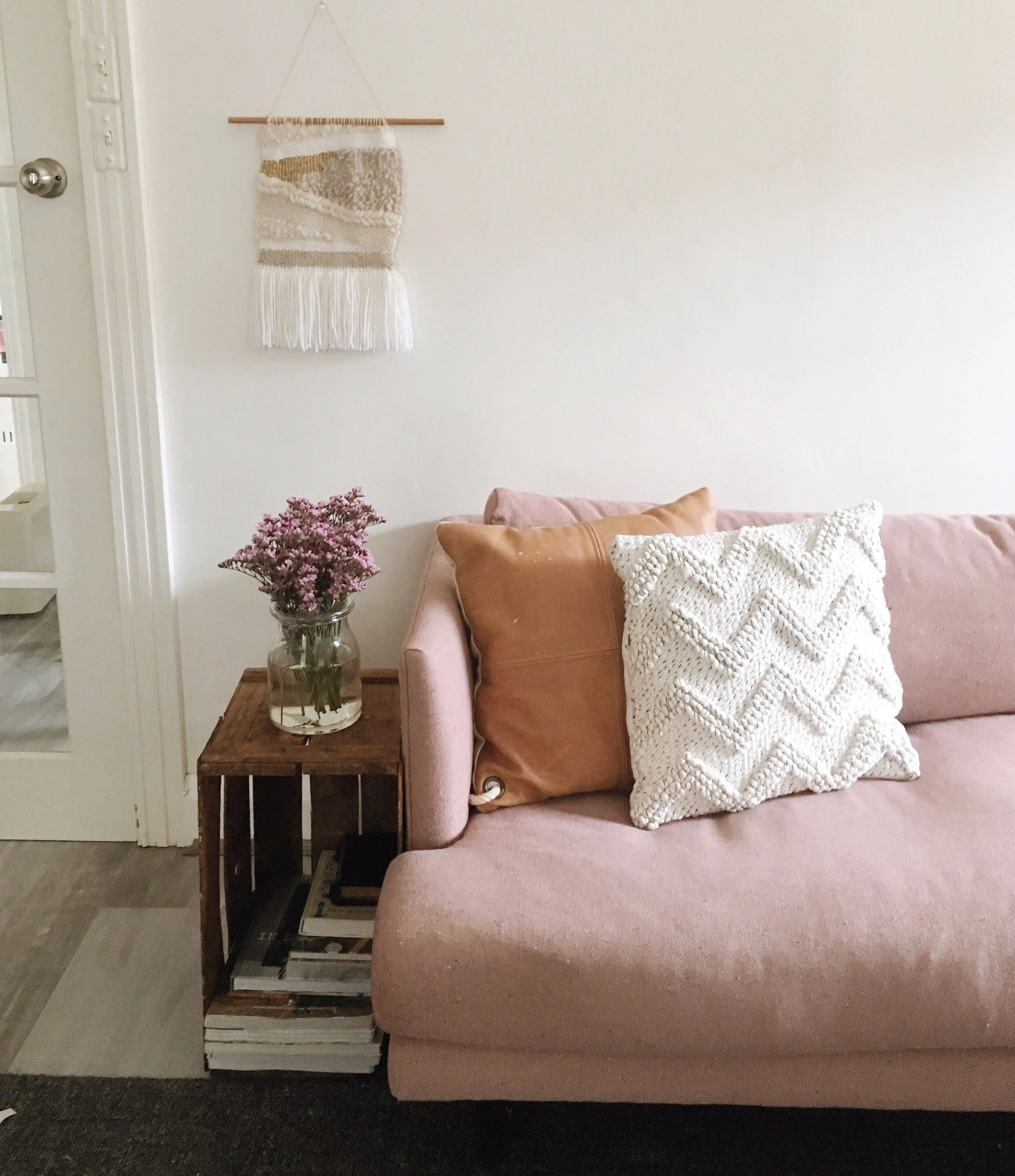 A pink sofa with a tan leather pillow and a white textured pillow, a wooden side table with a glass jar of pink flowers, and a wall hanging with neutral colors in a cozy living room.